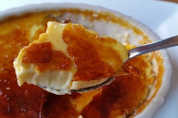 5. To serve, sprinkle each custard with a thin layer of sugar. Carefully ignite a kitchen butane torch and caramelize the sugar by moving the torch back and forth over the custard, about an inch or 2 away from it. Sprinkle another thin layer of sugar over the first layer and torch it, repeating another 2 times or until the desired caramel layer is achieved. Serve immediately.